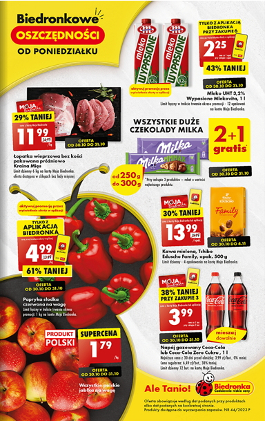 {loadposition linkBiedronka1} 'Biedronkowe oszczędności od poniedziałku do soboty' - nowa gazetka promocyjna sieci sklepów Biedronka. Polecane promocje z gazetki sieci Biedronka: Łopatka wieprzowa bez kości pakowana prózniowo Kraina Mięs 1 kg - 11,99 zł*. Mleko Wypasione Mlekovita 1 L…