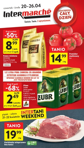 {loadposition linkIntermarche2} 'Oszczędzaj cały dzień' - nowa gazetka promocyjna sieci sklepów Intermarche Polecane promocje z gazetki Intermarche: Kawa mielona Woseba Mocca Fix Gold 250 g - 8,99 zł*. Pomidory malinowe 1 kg - 14,99 zł. Karkówka wieprzowa bez kości…