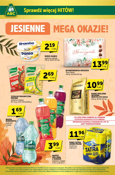 {loadposition linkABC} 'Jesienne mega okazje' - nowa gazetka promocyjna sieci sklepów ABC. Polecane promocje z gazetki ABC: Kawa mielona Woseba Mocca Fix Gold 250 g - 10,99 zł. Woda mineralna Rodowita z Roztocza 1 L - 1,69 zł. Napój…