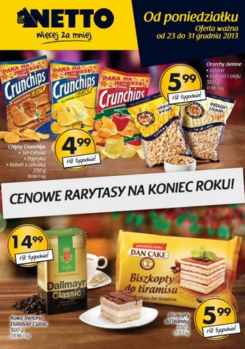 {loadposition linkNetto} Nowa gazetka promocyjna Netto - "Cenowe rarytasy na koniec roku!". Polecane promocje z gazetki Netto: Kawa mielona Dallmayr Classic 500 g - 14,99 zł. Biszkopty do tiramisu 350 g - 5,99 zł. Szynka szwarcwaldzka 100 g…