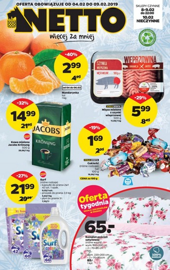 {loadposition linkNetto} Nowa gazetka promocyjna sieci sklepów Netto. Polecane promocje z gazetki Netto: Mandarynki 1 kg - 2,99 zł. Kawa mielona Jacobs Kronung 500 g - 14,99 zł. Mięso mielone z szynki wieprzowej 500 g - 5,99…
