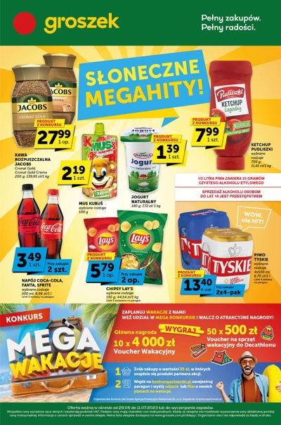 {loadposition linkGroszek} 'Słoneczne megahity!' - nowa gazetka promocyjna sieci sklepów Groszek. Polecane promocje z gazetki Groszek: Kawa rozpuszczalna Jacobs 200 g - 27,99 zł. Mus Kubuś 100 g - 2,19 zł. Jogurt naturalny Piątnica 180 g - 1,39 zł.…