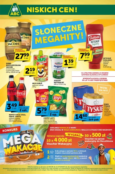 {loadposition linkABC} 'Słoneczne megahity' - nowa gazetka promocyjna sieci sklepów ABC. Polecane promocje z gazetki ABC: Kawa rozpuszczalna Jacobs 200 g - 27,99 zł. Chipsy Lay's 130 g - 5,79 zł*. Ketchup Pudliszki 700 g - 7,99 zł. …