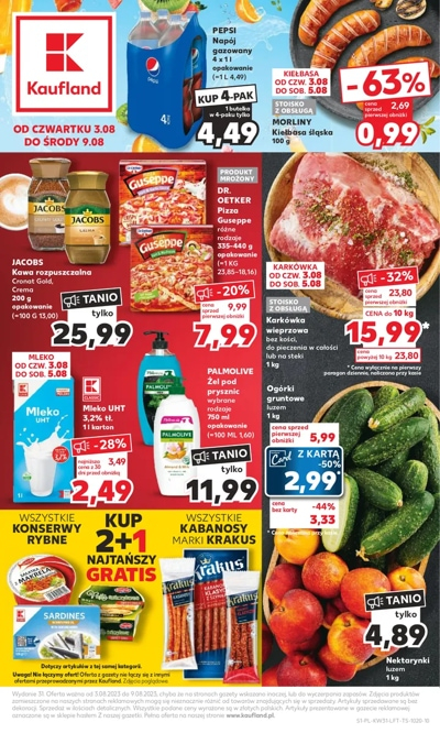 {loadposition linkKaufland6} Nowa gazetka promocyjna sieci marketów Kaufland. Polecane promocje z gazetki Kaufland: Napój gazowany Pepsi 1 L - 4,45 zł*. Kiełbasa śląska Morliny 100 g - 0,99 zł**. Kawa rozpuszczalna Jacobs 200 g - 25,99 zł. *…