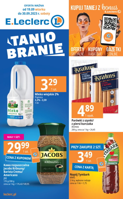 {loadposition linkEleclerc2} 'Tanio branie' - nowa gazetka promocyjna sieci handlowej E.Leclerc. Polecane promocje z gazetki E.Leclerc: Mleko wiejskie Piątnica 1 L - 3,29 zł. Kawa rozpuszczalna Jacobs 200 g - 29,99 zł*. Parówki z szynki lub z piersi kurczaka…