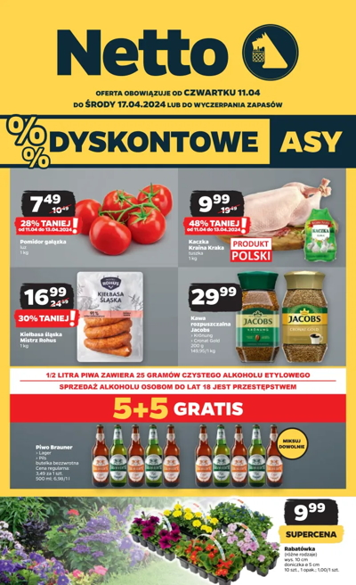 'Dyskontowe asy' - nowa gazetka promocyjna sieci sklepów Netto. Polecane promocje z gazetki Netto: Pomidory gałązka 1 kg - 7,49 zł*. Kaczka Kraina Kraka 1 kg - 9,99 zł*. Kawa rozpuszczalna Jacobs 200 g - 29,99 zł. * - cena…