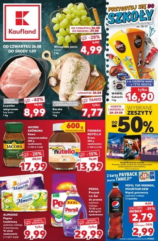 {loadposition linkKaufland} 'Przygotuj się do szkoły' - nowa gazetka promocyjna sieci marketów Kaufland. Polecane promocje z gazetki Kaufland: Cukierki Wawel 1 kg - 16,90 zł. Krem Ferrero Nutella 600 g - 13,99 zł. Kawa rozpuszczalna Jacobs Kronung 200 g…