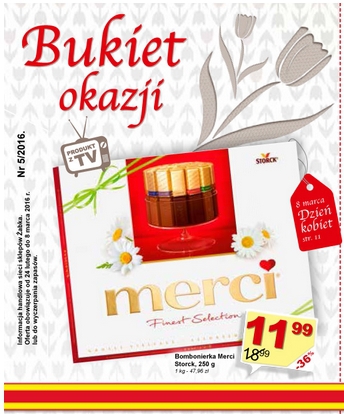 Nowa gazetka promocyjna sieci sklepów Żabka - "Bukiet okazji". Polecane promocje z gazetki Żabka: Bombonierka Merci 250 g - 11,99 zł. Wafle Pryncypałki w czekoladzie dr Gerard 235 g - 4,99 zł. Kawa rozpuszczalna Jacobs Kronung 100 g…