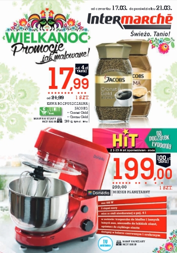 {loadposition linkIntermarche} Nowa gazetka promocyjna sieci handlowej Intermarche - "Wielkanoc. Promocje jak malowane!". Polecane promocje z gazetki Intermarche: Kawa rozpuszczalna Jacobs Cronat Gold 200 g - 17,99 zł. Mikser planetarny Domedia - 199 zł. Konfitura Łowicz 240 g -…