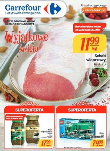 {loadposition linkCarrefour} Nowa gazetka promocyjna sieci handlowej Carrefour - "Wyjątkowe święta". Polecane promocje z gazetki Carrefour: Schab wieprzowy bez kości 1 kg - 11,99 zł. Kawa rozpuszczalna Jacobs 200 g - 17,99 zł. Klocki LEGO Ciężarówka ekipy wyścigowej -…