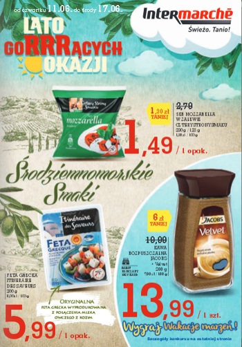{loadposition linkIntermarche} Nowa gazetka promocyjna sieci handlowej Intermarche - "Lato gorrrących okazji". Polecane promocje z gazetki Intermarche: Ser Mozzarella w zalewie 230 g - 1,49 zł. Feta grecka Itineraire Des Saveurs 200 g - 5,99 zł. Kawa rozpuszczalna Jacobs…