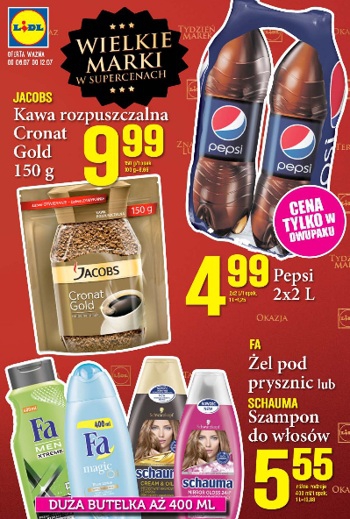 {loadposition linkLidl} Nowa gazetka promocyjna Lidl - "Wielkie marki w supercenach". Polecane promocje z gazetki Lidl: Kawa rozpuszczalna Jacobs Cronat Gold 150 g - 9,99 zł. Pepsi 2x2 L - 4,99 zł. Żel pod prysznic Fa 400 ml -…