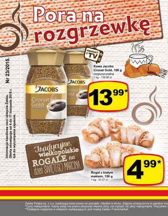 Nowa gazetka promocyjna sieci sklepów Żabka - "Pora na rozgrzewkę". Polecane promocje z gazetki Żabka: Kawa rozpuszczalna Jacobs Cronat Gold 100 g - 13,99 zł. Bombonierka Alpejskie Mleczko Milka 330 g - 8,99 zł. Ser topiony Hochland 130…