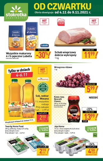 {loadposition linkStokrotka} Nowa gazetka promocyjna sieci sklepów Stokrotka. Polecane promocje z gazetki Stokrotka: Schab wieprzowy dobrze wykrojony 1 kg - 11,99 zł. Winogrono różowe 1 kg - 5,99 zł. Kawa rozpuszczalna Nescafe Classic 200 g - 13,99 zł. …