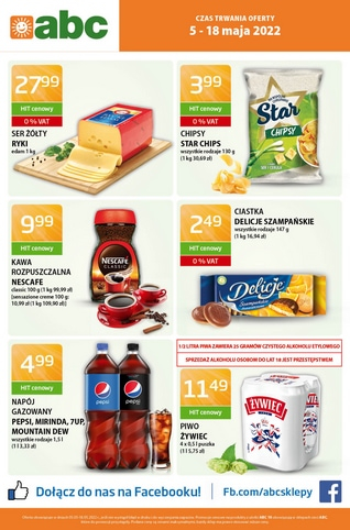 {loadposition linkABC} Nowa gazetka promocyjna sieci sklepów ABC. Polecane promocje z gazetki ABC: Ser żółty Edam Ryki 1 kg - 27,99 zł. Kawa rozpuszczalna Nescafe Classic 100 g - 9,99 zł. Ciastka Delicje Szampańskie 147 g - 2,49 zł.…