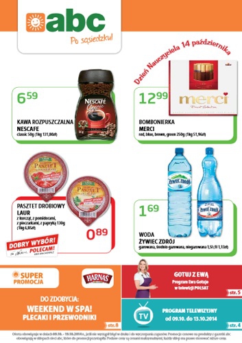 Nowa gazetka promocyjna sklepów ABC. Polecane promocje z gazetki ABC: Kawa rozpuszczalna Nescafe Classic 50 g - 6,59 zł. Bombonierka Merci 250 g - 12,99 zł. Woda Żywiec Zdrój 1,5 L - 1,69 zł. Oferta ważna od…