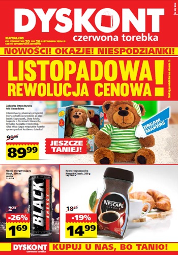 Nowy katalog sieci handlowej Czerwona Torebka - "Listopadowa rewolucja cenowa". Polecane promocje z katalogu sieci Czerwona Torebka: Zabawka interaktywna Miś Gawędziarz - 89,99 zł. Napój energetyzujący Black 250 ml - 1,69 zł. Kawa rozpuszczalna Nescafe Classic 200 g…