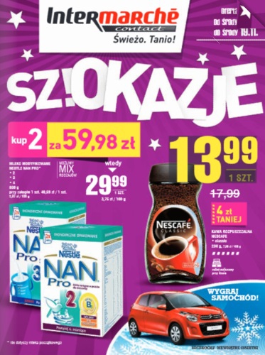 {loadposition linkIntermarche} Nowa gazetka promocyjna sieci handlowej Intermarche - "SZ!OKAZJE". Polecane promocje z gazetki Intermarche: Mleko modyfikowane Nestle Nan Pro 2x800 g - 59,98 zł. Kawa rozpuszczalna Nescafe Classic 200 g - 13,99 zł. Papier toaletowy Labell 8 rolek…