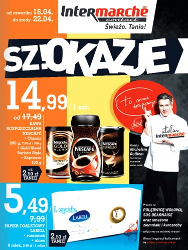 {loadposition linkIntermarche} Nowa gazetka promocyjna sieci handlowej Intermarche - "Sz!okazje". Polecane promocje z gazetki Intermarche: Kawa rozpuszczalna Nescafe Classic 200 g - 14,99 zł. Papier toaletowy Labell 8 rolek - 5,49 zł. Płyn do mycia naczyń Ludwik 500 g…