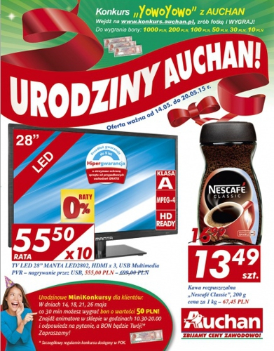 {loadposition linkAuchan} Nowa gazetka promocyjna Auchan - "Urodziny Auchan!". Polecane promocje z gazetki Auchan: Telewizor LED 28" Manta LED2802 - 555 zł. Kawa rozpuszczalna Nescafe Classic 200 g - 13,49 zł. Żwirek silikonowy dla kota Casti 2x3,8 L -…