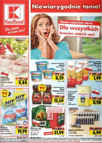 {loadposition linkKaufland} Nowa gazetka promocyjna marketu Kaufland - "Niewiarygodnie tanio!". Polecane promocje z gazetki Kaufland: Proszek do prania Bryza 7 kg - 19,99 zł. Kawa rozpuszczalna Nescafe Classic 200 g - 13,69 zł. Baterie alkaliczne AA LR06 lub…