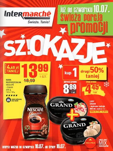 {loadposition linkIntermarche} Nowa gazetka promocyjna sieci handlowej Intermarche - "Sz!okazje". Polecane promocje z gazetki Intermarche: Kawa rozpuszczalna Nescafe Classic 200 g - 13,99 zł. Lody Grand 2x900 ml - 13,34 zł. Papier toaletowy Velvet 8 rolek - 6,99 zł.…