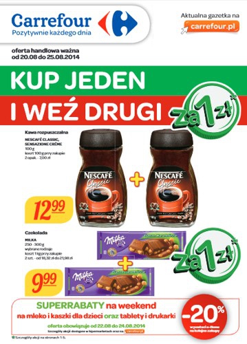 {loadposition linkCarrefour} Nowa gazetka promocyjna sieci handlowej Carrefour - "Kup jeden i weź drugi za 1 zł". Polecane promocje z gazetki Carrefour: Kawa rozpuszczalna Nescafe Classic 2x100 g - 13,99 zł. Czekolada Milka 2x300 g - 10,99 zł. Margaryna…