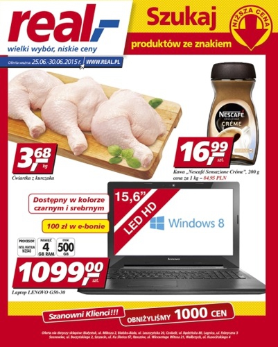 Nowa gazetka promocyjna sieci handlowej Real. Polecane promocje z gazetki Real: Ćwiartka z kurczaka 1 kg - 3,68 zł. Kawa rozpuszczalna Nescafe Sensazione Creme 200 g - 16,99 zł. Laptop Lenovo G50-30 - 1099 zł. Oferta ważna…