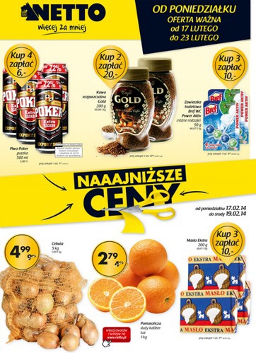 {loadposition linkNetto} Nowa gazetka promocyjna Netto - "Naaajniższe ceny". Polecane promocje z gazetki Netto: Piwo Poker 500 ml 4 sztuki - 6 zł. Kawa rozpuszczalna Gold 200 g 2 sztuki - 20 zł. Zawieszka toaletowa Bref WC Power…