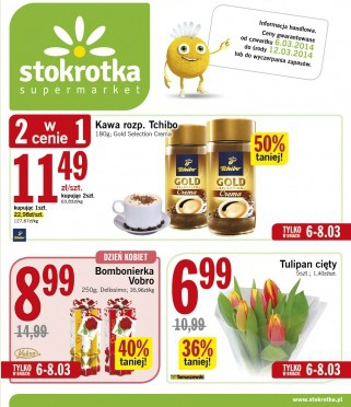 Nowa gazetka promocyjna sieci handlowej Stokrotka. Polecane promocje z gazetki Stokrotka: Kawa rozpuszczalna Tchibo Gold 200 g 2 sztuki - 11,49 zł. Bombonierka Vobro 250 g - 8,99 zł. Tulipan cięty 5 sztuk - 6,99 zł. Oferta…