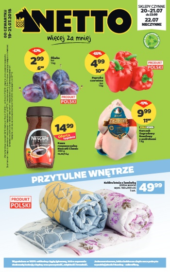 {loadposition linkNetto} 'Przytulne wnętrze' - nowa gazetka promocyjna sieci sklepów Netto. Polecane promocje z gazetki Netto: Kołdra letnia z lamówką 160x200 cm - 49,99 zł. Kawa rozpuszczalna Nescafe Classic 200 g - 14,99 zł. Kurczak zagrodowy rosołowy z podrobami…