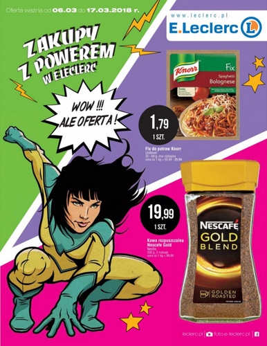 {loadposition linkEleclerc} 'Zakupy z powerem. Wow !!! Ale oferta !' - nowa gazetka promocyjna sieci handlowej E.Leclerc. Polecane promocje z gazetki E.Leclerc: Fix do potraw Knorr - 1,79 zł. Kawa rozpuszczalna Nescafe Gold 200 g - 19,99 zł.…