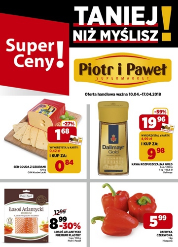 'Taniej niż myślisz!' - nowa gazetka promocyjna sieci sklepów Piotr i Paweł. Polecane promocje z gazetki Piotr i Paweł: Ser Gouda z dziurami OSM Kosów Lacki 100 g - 0,84 zł*. Kawa rozpuszczalna Dallmayr Gold 200 g - 9,98…
