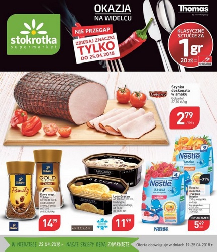 'Okazja na widelcu' - nowa gazetka promocyjna sieci sklepów Stokrotka. Polecane promocje z gazetki Stokrotka: Szynka doskonała w smaku Gobarto 1 kg - 2,79 zł. Kawa rozpuszczalna Tchibo Gold Selection Crema 200 g - 14,99 zł. Lody Grycan…