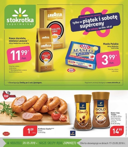 'Dwudniowy luz cenowy. Tylko w piątek i sobotę superceny' - nowa gazetka promocyjna sieci sklepów Stokrotka. Polecane promocje z gazetki Stokrotka: Kiełbasa śląska Sława 100 g - 1,09 zł. Kawa rozpuszczalna Tchibo Gold Selection Crema 200 g - 14,99…