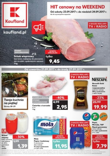{loadposition linkKaufland} Nowa gazetka promocyjna marketu Kaufland. Polecane promocje z gazetki Kaufland: Schab wieprzowy bez kości 1 kg - 9,45 zł. Ćwiartka z kurczaka 1 kg - 2,95 zł. Kawa rozpuszczalna Nescafe Gold 200 g - 19,99…