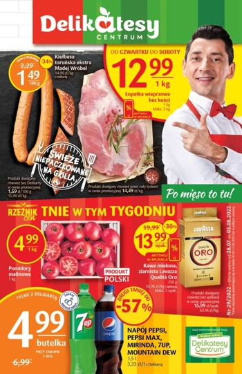 {loadposition linkDelikatesyCentrum} 'Rzeźnik cen' - nowa gazetka promocyjna Delikatesów Centrum. Polecane promocje z gazetki Delikatesów Centrum: Kiełbasa Toruńska ekstra Madej Wróbel 100 g - 1,49 zł*. Pomidory malinowe 1 kg - 4,99 zł. Kawa mielona lub ziarnista Lavazza Qualita…