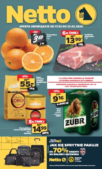 Nowa gazetka promocyjna sieci sklepów Netto. Polecane promocje z gazetki Netto: Pomarańcze siatka 1 kg - 3,69 zł. Karkówka wieprzowa 1 kg - 13,99 zł. Kawa ziarnista Lavazza Qualita Oro 1 kg - 55 zł. …