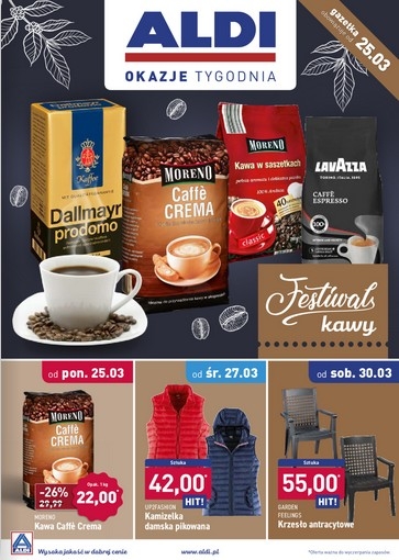 {loadposition linkAldi} 'Festiwal kawy' - nowa gazetka promocyjna Aldi. Polecane promocje z gazetki Aldi: Kawa ziarnista Moreno Caffe Crema 1 kg - 22 zł. Kamizelka damska pikowana Up2Fashion - 42 zł. Krzesło antracytowe Garden Feelings - 55 zł.…