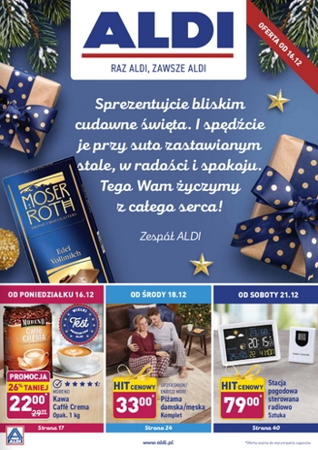 {loadposition linkAldi} Nowa gazetka promocyjna sieci sklepów Aldi. Polecane promocje z gazetki Aldi: Kawa ziarnista Moreno Caffe Crema 1 kg - 22 zł. Piżama damska lub męska - 33 zł. Stacja pogodowa sterowana radiowo - 79 zł. …