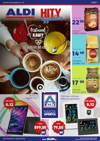 {loadposition linkAldi} Nowa gazetka promocyjna Aldi - "Festiwal kawy". Polecane promocje z gazetki Aldi: Kawa ziarnista Moreno Caffe Crema 1 kg - 22,50 zł. Kawa mielona Lavazza Qualita Oro 250 g - 14,40 zł. Kawa rozpuszczalna Jacobs Cronat…