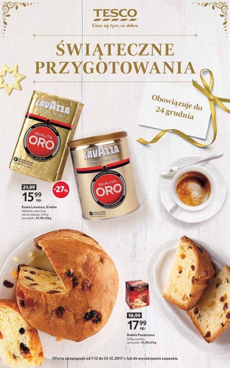 Nowa gazetka promocyjna sieci sklepów Tesco - "Świąteczne przygotowania". Polecane promocje z gazetki Tesco: Kawa mielona lub ziarnista Lavazza 250 g - 15,99 zł. Babka Panettone 500 g - 17,99 zł. Drożdże Babuni Savpol 100 g - 0,79 zł.…