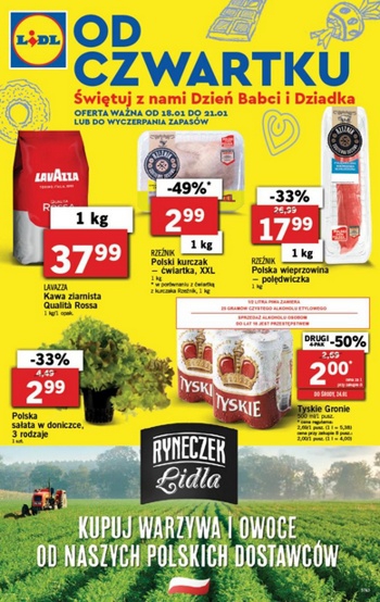 {loadposition linkLidl2} Nowa żółta gazetka promocyjna sieci sklepów Lidl - "Od czwartku świętuj z nami Dzień Babci i Dziadka". Polecane promocje z gazetki sklepów Lidl: Kawa ziarnista Lavazza Qualita Rossa 1 kg - 37,99 zł. Polski kurczak - ćwiartka…