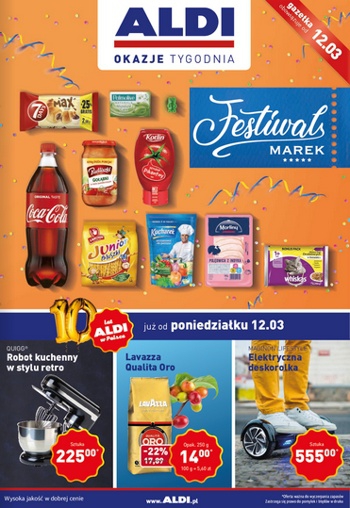 {loadposition linkAldi} 'Festiwal marek' - nowa gazetka promocyjna Aldi. Polecane promocje z gazetki Aldi: Robot kuchenny w stylu retro Quigg - 225 zł. Kawa ziarnista Lavazza Qualita Oro 250 g - 14 zł. Elektryczna deskorolka Maginon Lifestyle -…