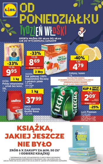 {loadposition linkLidl1} 'Od poniedziałku tydzień włoski' - nowa niebieska gazetka promocyjna sieci sklepów Lidl. Polecane promocje z gazetki sklepów Lidl: Sok jabłkowy 100% bezpośrednio tłoczony z polskich jabłek Solevita 3 L - 8,69 zł. Kawa ziarnista Lavazza Qualita Rossa…