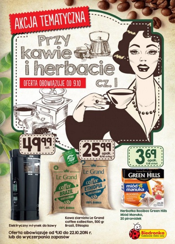 {loadposition linkBiedronka} Nowa gazetka promocyjna sieci handlowej Biedronka - "Przy kawie i herbacie". Polecane promocje z gazetki sieci Biedronka: Elektryczny młynek do kawy - 49,99 zł. Kawa ziarnista Le Grand coffee collection 500 g - 25,99 zł. Herbata Rooibos…
