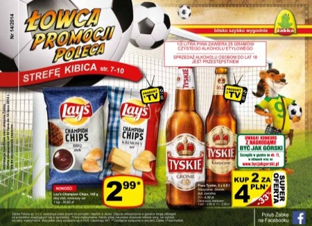 Nowa gazetka promocyjna sieci sklepów Żabka - "Łowca promocji poleca strefę kibica". Polecane promocje z gazetki Żabka: Chipsy Lay's Champion 145 g - 2,99 zł. Piwo Tyskie 2x500 ml - 4 zł. Kefir Jovi 350 g - 1,99…