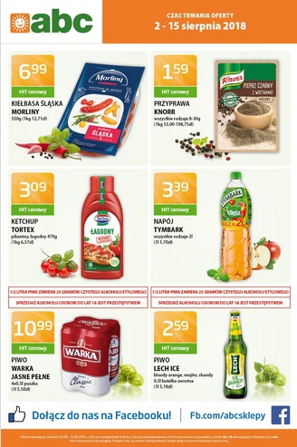 Nowa gazetka promocyjna sieci sklepów ABC. Polecane promocje z gazetki ABC: Kiełbasa śląska Morliny 550 g - 6,99 zł. Ketchup Tortex 470 g - 3,09 zł. Napój Tymbark 2 L - 3,39 zł. Oferta…