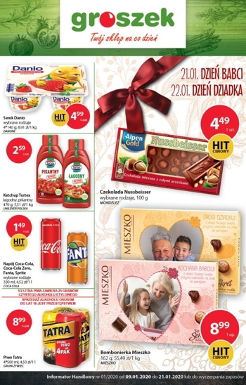 {loadposition linkGroszek} Nowa gazetka promocyjna sieci sklepów Groszek. Polecane promocje z gazetki Groszek: Bombonierka Mieszko 162 g - 8,99 zł. Serek Danio 4x140 g - 4,99 zł. Ketchup Tortex 470 g - 2,59 zł. …
