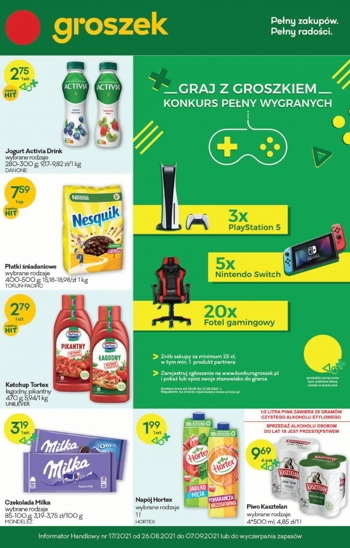 {loadposition linkGroszek} Nowa gazetka promocyjna sieci sklepów Groszek. Polecane promocje z gazetki Groszek: Jogurt Danone Activia Drink 280/300 g - 2,75 zł. Płatki śniadaniowe Nesquik 400/500 g - 7,59 zł. Ketchup Tortex 470 g - 2,79 zł. …